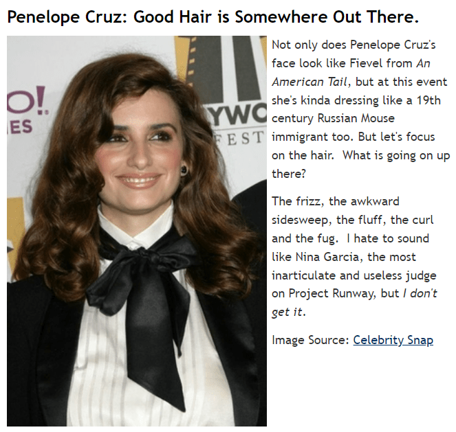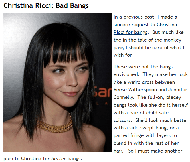 Written by the anonymous ‘Bad Hair Czar’, the site points a finger at celebs who could do with a new do. It tackles such tough topics as whether Kelly Osbourne is wearing a wig, whether Christina Ricci looks better with or without bangs, and whether Penelope Cruz needs to rethink her brushing technique. And like many lame blogs, it’s not updated often enough – which probably is a good thing.