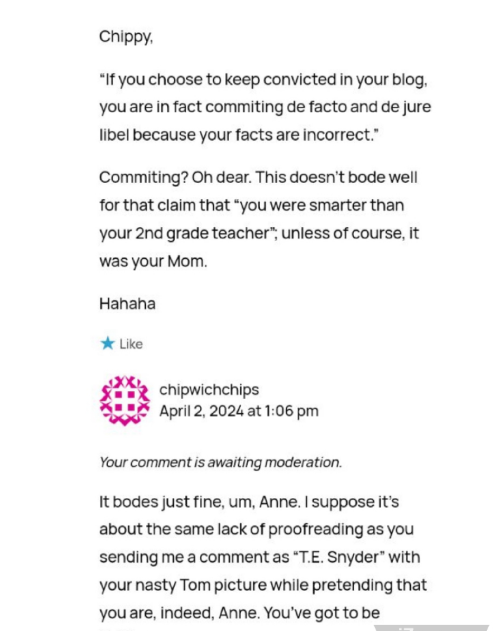 With the mindset of a whining child, the Painter takes issue with “T E Snyder” responding to my posts and believes that because Mr. Snyder responded to Mr. Chipwich, Mr. Snyder has to be me.